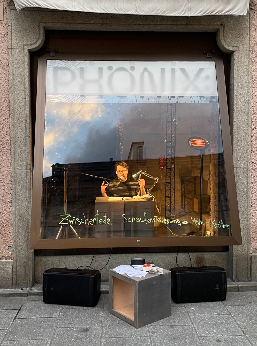 Am sehr kalten Tag vor Silvester, also zwischen den Jahren, habe ich im Rahmen der Leerstandsbespielung des Theaters in einem Schaufenster auf der Linzer Landstraße 31 gelesen. Es geht um das große Zwischen: zwischen Menschen, zwischen Orten, zwischen den Stühlen.